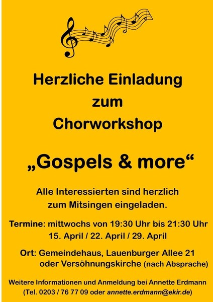 Die Proben finden mittwochs (15., 22., und 29. April) von 19:30 Uhr bis 21:30 Uhr statt. Treffpunkt ist das Gemeindehaus, Lauenburger Allee 21 oder die Versöhnungskirche, Lauenburger Allee 23 – der genaue Ort wird vorher bekanntgegeben.