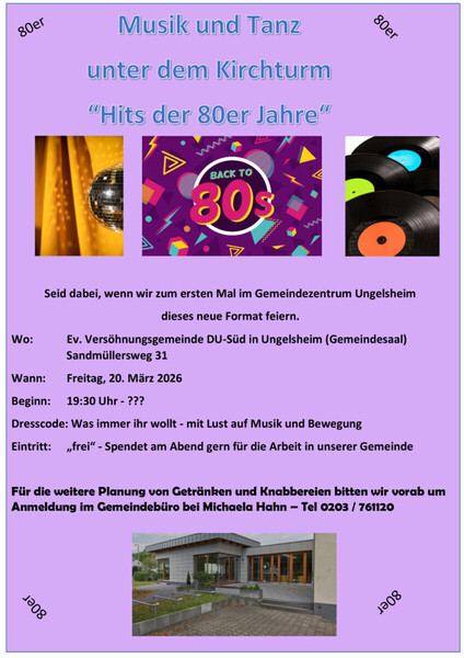 Wir laden Sie/Euch ganz herzlich zu unserem ersten „Musik und Tanz unterm Kirchturm“ mit den Hits der 80er Jahre in das Gemeindezentrum Ungelsheim ein.