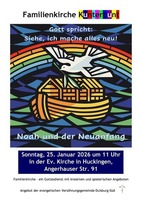 ...so lautet die Jahreslosung. Die Sintfluterzählung ist die Erzählung eines radikalen Neuanfangs. In der Familienkirche, einem Gottesdienst für Familien mit kreativen und spielerischen Angeboten, hören wir die Geschichte von Noah und der Arche und Gottes Versprechen.