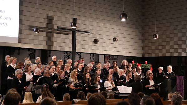 Mehr als 300 Besucherinnen und Besucher kamen am 16. November in die Versöhnungskirche nach Großenbaum, um das Konzert mit dem Titel "Klänge des Friedens" mitzuerleben. Die Kantorei unter der Leitung von Kantorin Annette Erdmann brachte ein abwechslungsreiches Programm mit Liedern von W. A. Mozart, Beethoven, Mendelssohn, John Rutter, Amy Beach u. a. zu Gehör. Auch ein Gebet nach einem ukrainischen Hymnus von Mykola Lysenko und das hebräische Friedenslied „Ose shalom“ standen auf dem Programm. Begleitet wurde die Kantorei von Hyekoung Kang am Klavier und Anja auf der Heiden an der Querflöte, für besondere klangliche Akzente sorgte die litauische Harfenistin Giedrė Šiaulytė. Beim abschließenden Kanon "Dona nobis pacem" war das Publikum zum Mitsingen eingeladen.
