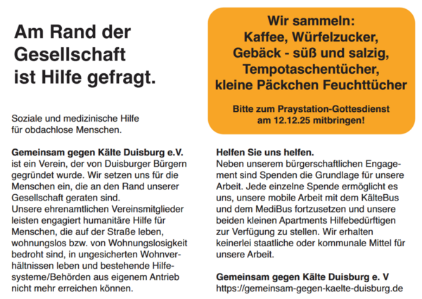 Wie in den vergangenen Jahren wird wieder für eine besondere Aktion gesammelt: dieses Mal für "Gemeinsam gegen Kälte", einen Verein, der sich um Obdachlose kümmert. Alle wichtigen Infos zur Spendenaktion auf dem Plakat!