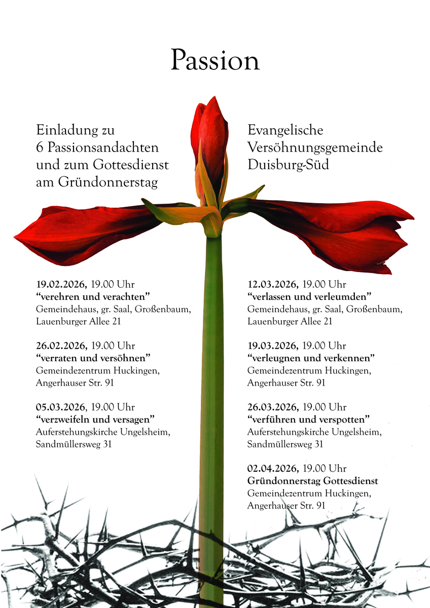 Wir laden herzlich ein zu unseren Passionsandachten, die donnerstags wechselweise an den drei Standorten unserer Gemeinde stattfinden. Der abschließende Gottesdienst am Gründonnerstag findet im Gemeindezentrum in Huckingen statt.