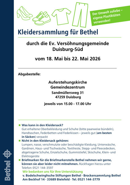 Auch in diesem Jahr findet wieder eine Kleidersammlung für Bethel in unserer Gemeinde statt. Abgegeben weden können die gut erhaltenen Sachen vom