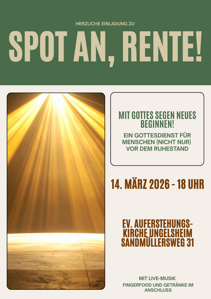 Der Übergang in die Rente bringt meist große Veränderungen mit – für die einen ist dies eine Herausforderung, für andere vielleicht auch problematisch – wieder andere freuen sich auf das, was kommt. Der Gottesdienst „Spot an, Rente!“ will dies thematisieren: gemeinsam mit anderen, die sich in derselben Situation befinden, wollen wir mit Gottes Segen Neues beginnen. Auch Familienmitglieder, Freunde und Kollegen sind herzlich dazu eingeladen.