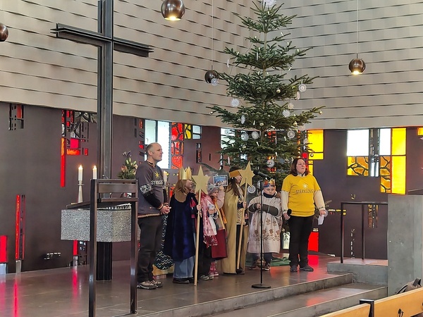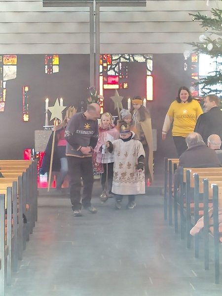 Es ist eine schöne Tradition: auch in diesem Jahr statteten die Sternsinger der Katholischen Schwestergemeinde der Großenbaumer Versöhnungskirche einen Besuch ab und brachten den Dreikönigssegen in unsere Gemeinde. Am 11. Januar besuchte die Sternsingergruppe den Sonntagsgottesdienst, sangen vom Stern über Bethlehem und stellten die diesjährige Sammelaktion der Sternsinger für Kinder in Bangladesh unter dem Motto "Schulen statt Fabriken" vor. Für Spenden stand auf dem Kollektentisch eine Sammelbüchse bereit, den Segensspruch zum Mitnehmen für die eigene Haustür gab es dazu. Danke!