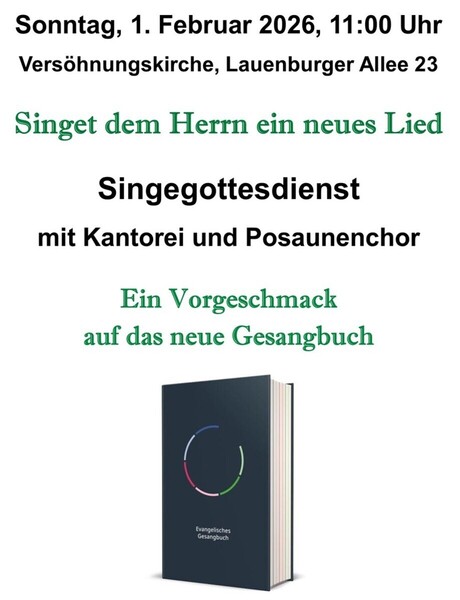 Dieser Gottesdienst wird ganz im Zeichen des kommenden Gesangbuches stehen. Das neue Gesangbuch wird voraussichtlich im Advent 2028 erscheinen, doch schon jetzt können erste Lieder bereits erprobt werden. In dem digitalen Erprobungsband sind z. B. Lieder zur Rubrik „Loben - Danken - Feiern“ sowie Lieder zu Psalmen enthalten.