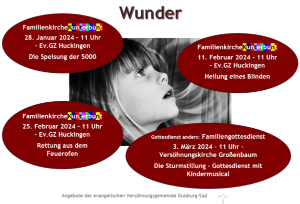 15.00 Uhr Familiengottesdienst, jeweils in der Großenbaumer Versöhnungskirche, in der Ev. Kirche in Huckingen und in der Ungelsheimer Auferstehungskirche