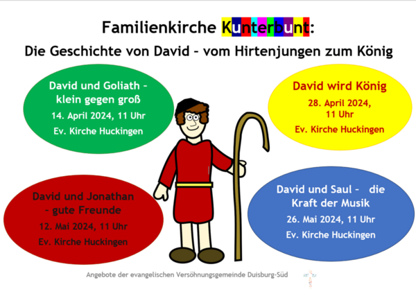 Im April und Mai werden wir vier Geschichten aus dem Leben Davids erzählen und erleben, wie er vom jüngsten Bruder und Hirtenjungen zum König über Israel wurde.