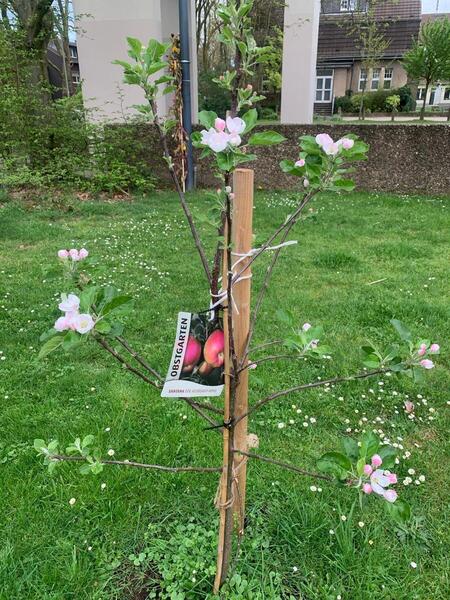 Die Besucherinnen und Besucher des Erntedankgottesdienstes in Großenbaum im letzten Herbst werden sich sicher erinnern: in einer Aktion nach dem Gottesdienst wurde damals auf der Wiese vor der Kirche ein kleiner Apfelbaum gepflanzt. Viele haben dabei zugeschaut.