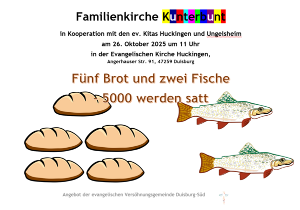 15.00 Uhr Familiengottesdienst, jeweils in der Großenbaumer Versöhnungskirche, in der Ev. Kirche in Huckingen und in der Ungelsheimer Auferstehungskirche