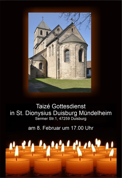 Am 08. Februar wollen wir um 17.00 Uhr in St. Dionysius Mündelheim einen Taizé-Gottesdienst feiern.